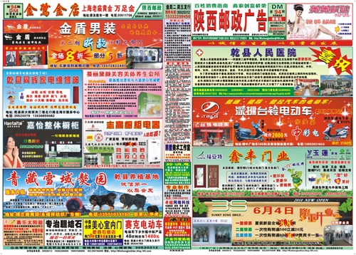 《郵政廣告》乾縣發(fā)行部:采用高級銅版紙全彩印刷,4開版面,逢周二、周五定期出版,覆蓋乾縣城內(nèi)生活區(qū)、居民區(qū)、商業(yè)區(qū)、辦公區(qū)、工業(yè)區(qū)、以及十五 ……
