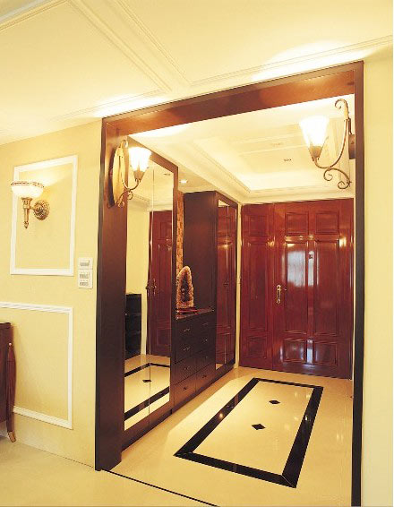 在玄關(guān)通往客廳的過道上安裝鏡子,地面的大理石磚鋪設(shè)鏡面,利用鏡子照射作用讓空間倍增。