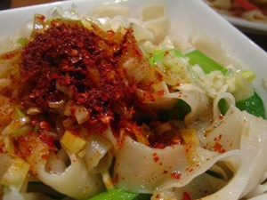 陜西扯面,又叫拉面、拽面、抻面、楨條面、香棍面等,據(jù)說已有3000多年的歷史。油潑面是在周代“禮面”的基礎(chǔ)上發(fā)展演變而來;秦漢時代稱之為“湯餅”,屬于“煮餅”類中的一種;隋唐時代叫“長命面”,意為下入鍋內(nèi)久煮不斷;宋元時代又改稱為“水滑面”。據(jù)元代韓奕所著《易牙遺意》記載:“水滑面:用十分白面揉搜成劑。一斤作十?dāng)?shù)塊。放在水中,候其面性發(fā)得十分滿足,逐塊抽拽,下湯煮熟。抽拽得闊薄乃好!鼻宕⒋蟪佳毘皆谄渲鳌端厥痴f略》中記載更為詳細:“其以水和面,入鹽、堿、清油揉勻,復(fù)以濕布,俟其融和,扯為細條。煮之,名為楨面!睍羞指郵:“作法以陜西朝邑、同州為最佳!标P(guān)于楨條面的形狀,書中說道:“其薄等于韭菜,其細比于掛面,可以成三棱之形,可以成中空之形!薄捌溆嗳缑嫫、面旗之類”。同樣一塊面,能址抻成多種不同的形狀,可見技術(shù)的精湛非同一般。 現(xiàn)今扯面的制法基本承襲舊法,和面時用鹽和堿面,以提高面團的筋韌性能,近10年來還有用“拉面劑”代替使用鹽堿的。如今扯面的形狀,有拉拽寬厚如腰帶的大寬長面,俗稱“biangbiang面”;有細薄似韭葉的二寬面;有細如銀針的龍須面;有粗繼如筷子的箸頭面;有三棱形似寶劍的劍刃面;有拽成短節(jié)的“空心面”。 烹調(diào)方法:水煮、油潑 味型:鮮香味、酸辣味、香辣味 原料:面粉25kg,菜籽油、香醋、醬油、食鹽、辣面、青菜、蔥花、純堿適量。 制作工藝: 1、和面:用溫開水化開鹽水和面,水分幾次倒入,先拉成面絮,后搓成塊,再蘸水調(diào)軟。每25kg面用12.5kg水、750g鹽、堿面100g反復(fù)折揉后,過10分鐘,再分批搓成大條,揉好,抹上油,再揪成100g重小劑子抹油搓成小條,用濕布蓋嚴待用。 2、抻面:(1)箸頭面:將面條搓細(約5—8條),用兩手輕輕扯長,再將“面頭”平列起來,用兩手將面提起用力扯,隨即在案上彈一下,兩臂張開再一扯,然后用右手將面的兩頭捏住提起,左手食指、中指伸入折處,略加彈動將面條分開,兩手伸開徐徐向外伸扯,再用左手無名指、小指把面條中間掛住,將左手食指與中指原掛的面頭交到右手,再左右向外伸扯,如此兩三次,即成箸頭細面,隨手投入開水鍋煮熟即成。(2)油潑面(即較寬條的扯面):將小條用手壓扁搟成寬片,在寬片中間用小搟杖橫壓一道紋,雙手左右分開扯成寬面片,再順中間壓紋處劈開,投入開水鍋里煮熟,撈在碗里。(3)潑油:面上放適量干辣面、蔥花,將燒開的火花油猛潑入碗里辣面上即成,潑面時面上可放各種時鮮青菜,如韭菜花、香椿、豆芽、青菜等,喜食辣子者還可放些油潑辣子。 米醋、醬油、食鹽、花椒油混在一起作調(diào)料,但調(diào)料須在潑油前和煮好的面調(diào)勻,這樣可以使味入面內(nèi)。 風(fēng)味特點:面長不斷,光滑筋韌,油香撲鼻,酸辣味美?谖兑部呻S各人嗜好而定。 繼承創(chuàng)新:用此法還可制成臊子扯面、炸醬扯面、炒蛋番茄扯面、羊肉燴扯面等 |
