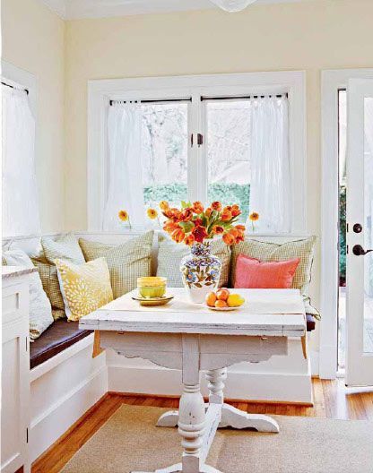 餐廳三面環(huán)窗,視野通透,利用其中兩扇窗戶的窗下空間,定制一個l形的軟榻,靠背的高度恰好貼合窗臺,家具與建筑因此形成無縫的連接。白色條紋木板定制的軟榻,裝飾有青藍色碎花布的椅墊,與藤木質(zhì)地的方形餐桌椅搭配,盡顯休閑愜意的鄉(xiāng)村格調(diào)。軟榻下方設(shè)計的抽屜,還滿足了儲物功能。周末把好友們帶回家吧,組織一個小小的聚會,圍繞軟榻聊聊工作,聊聊生活。